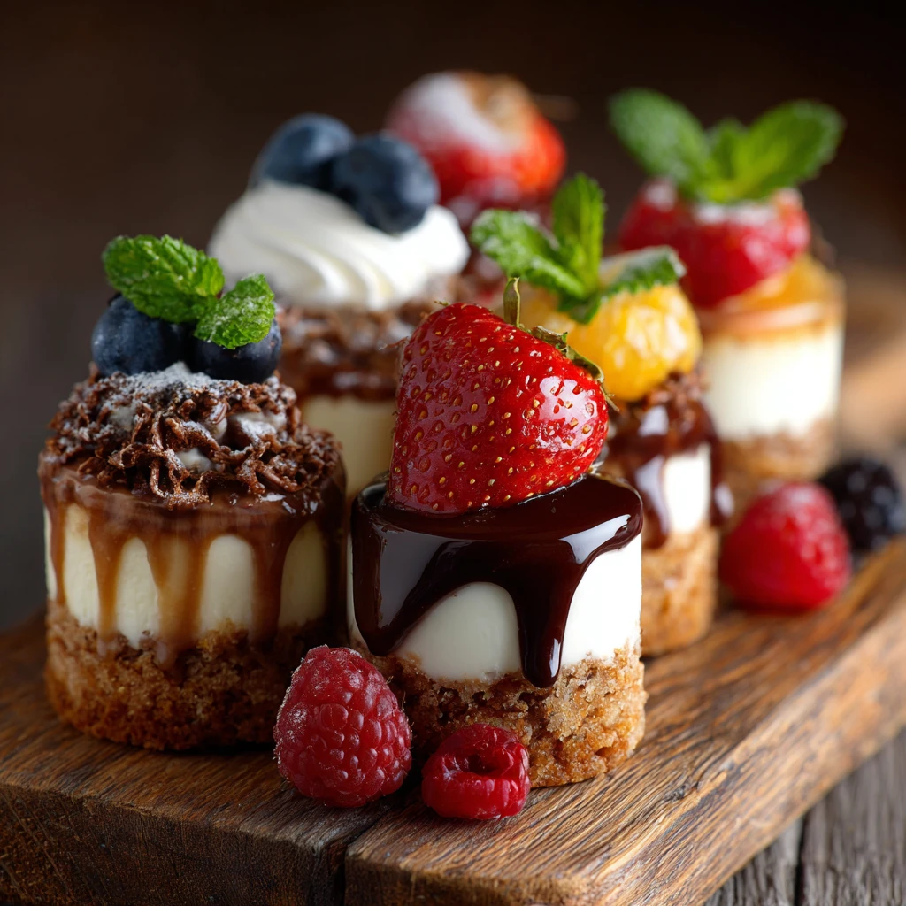 A classic dessert made mini! These bite-sized cheesecakes offer the same creamy, tangy goodness as their full-sized counterparts. A simple graham cracker crust supports a rich and decadent cheesecake filling, creating a perfect balance of textures and flavors.